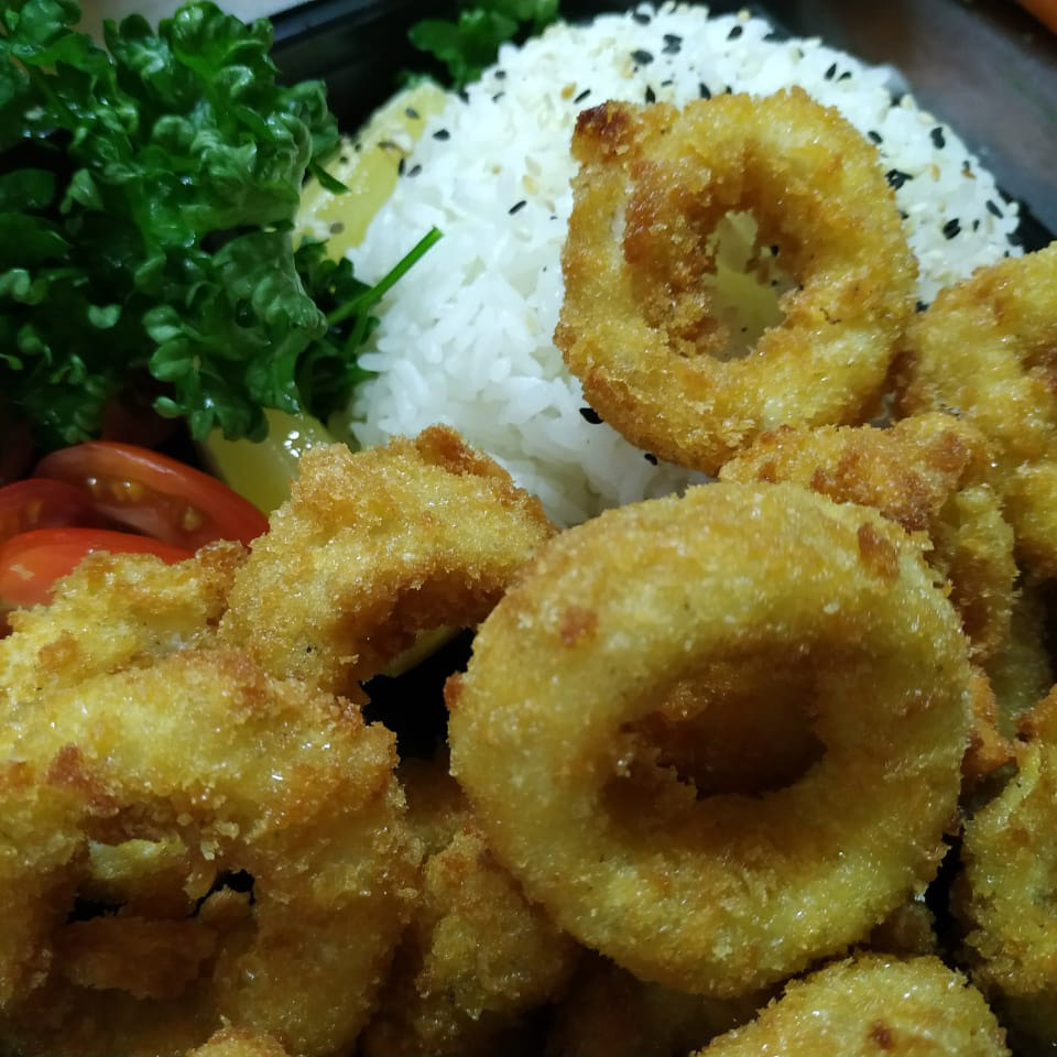 Apanados de tubos de calamar tiernizados. Cutlet of cuttlefish.