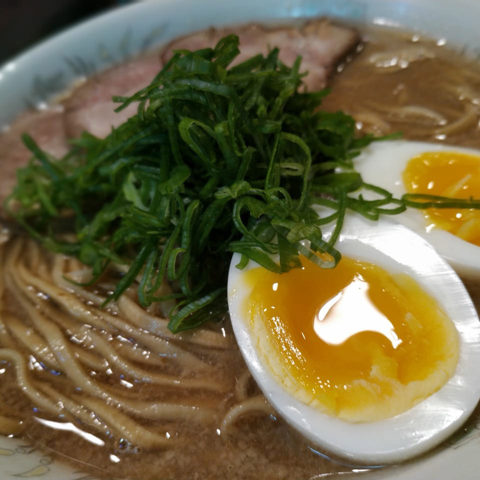 Dos fetas de cerdo, verdeo japonés y huevo duro.